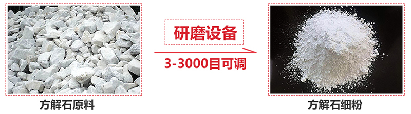 我們把方解石大塊物料經破碎機破碎到能進入磨粉機的入料細度(15mm-50mm),經過破碎后的方解石小塊物料經提升機送至料倉,再經振動給料機將其均勻定量的送入磨機研磨室內進行研磨。